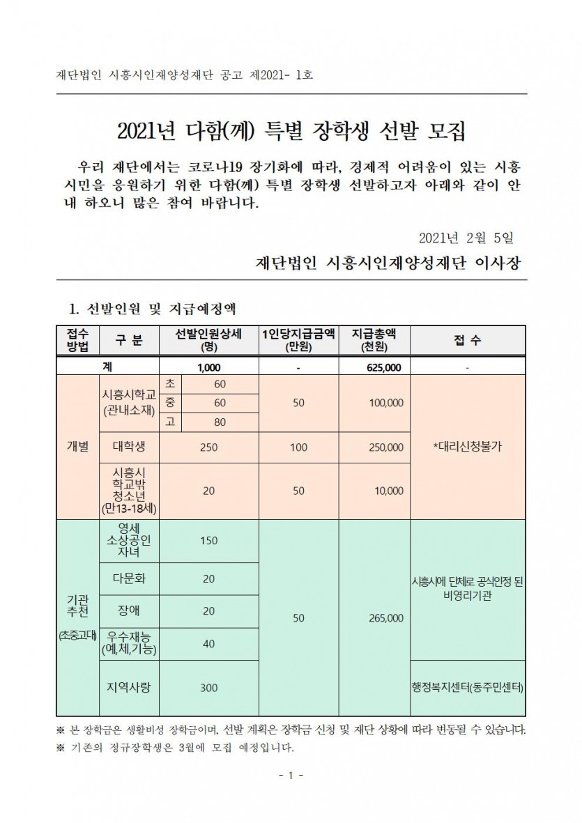 공고 제2021- 1호. 2021년 다함(께)특별장학생 선발 모집.hwp