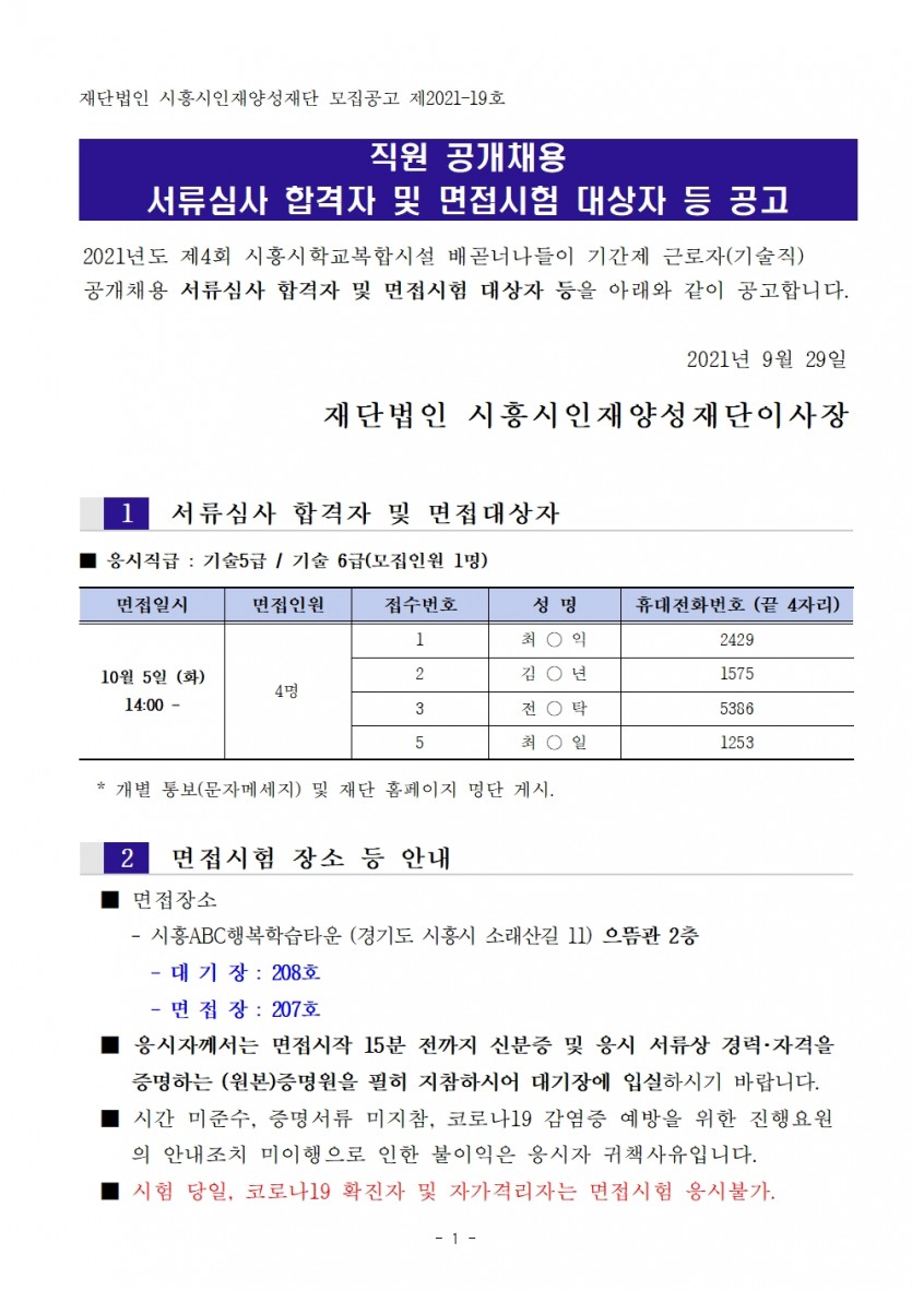 [채용] 2021년도 제4회 직원 공개채용 서류심사 합격자 및 면접시험 대상자 등 공고