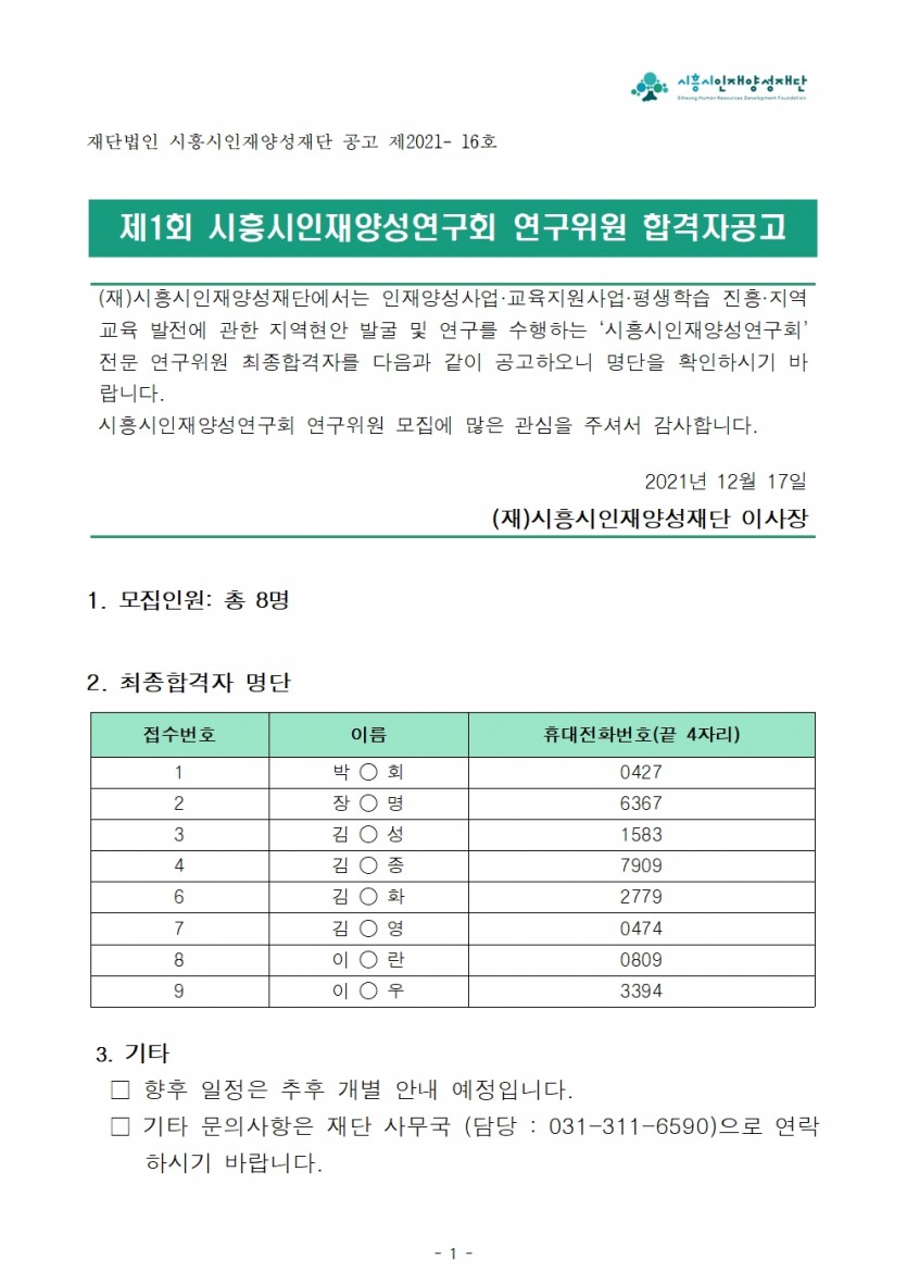 [공고] 제1회「시흥시인재양성연구회」연구위원 합격자공고