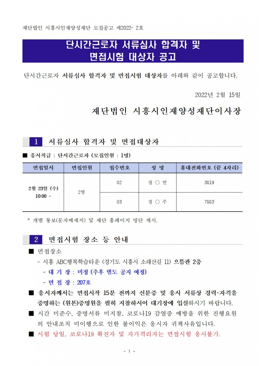 [채용] 단시간근로자 서류심사 합격자 및 면접시험 대상자 등 공고