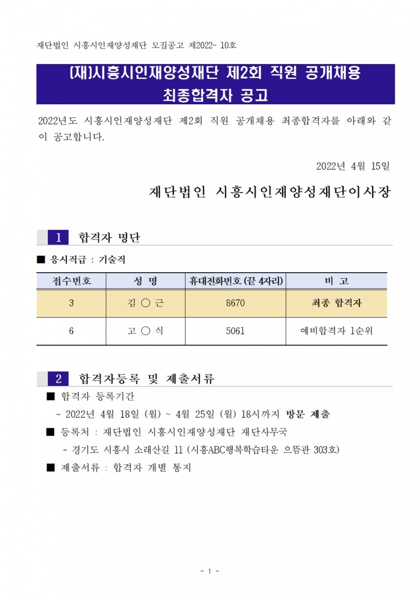 [채용] 2022년 제2회 직원 공개채용 최종합격자 공고