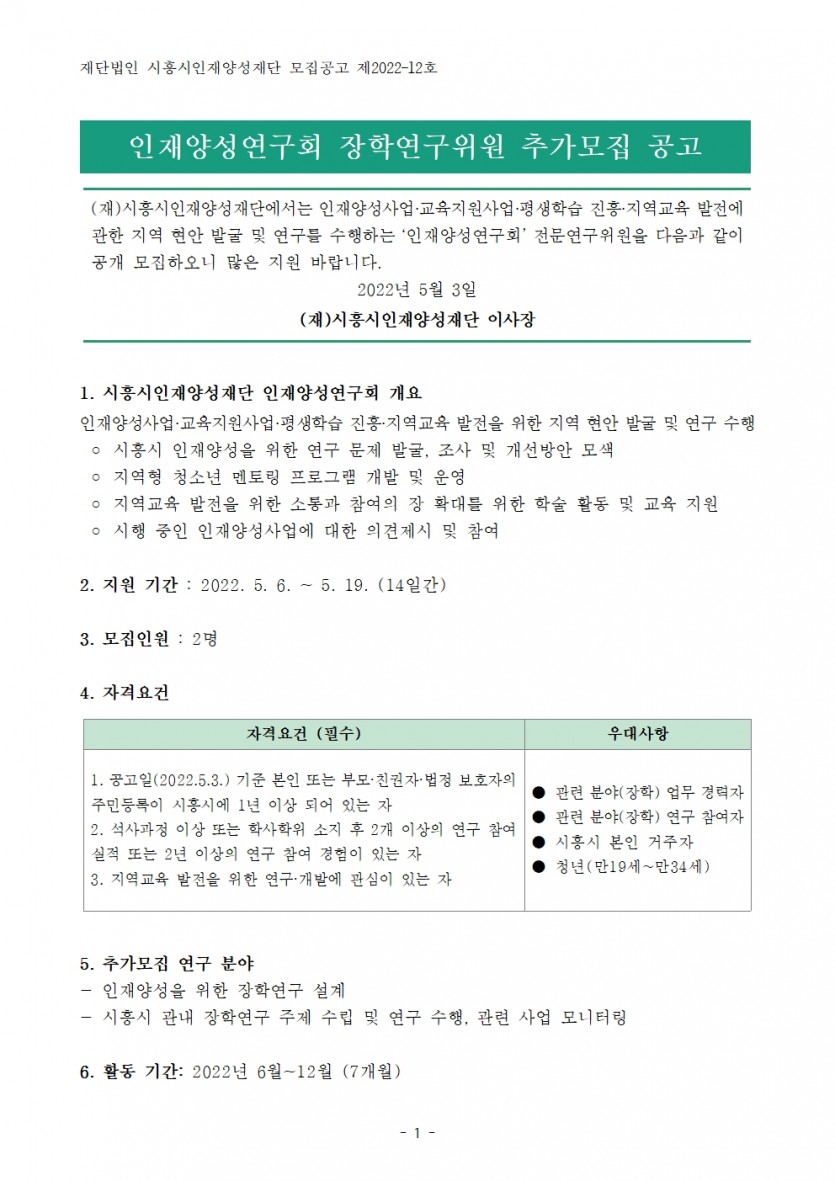 [공고] 인재양성연구회 장학연구위원 추가모집 공고