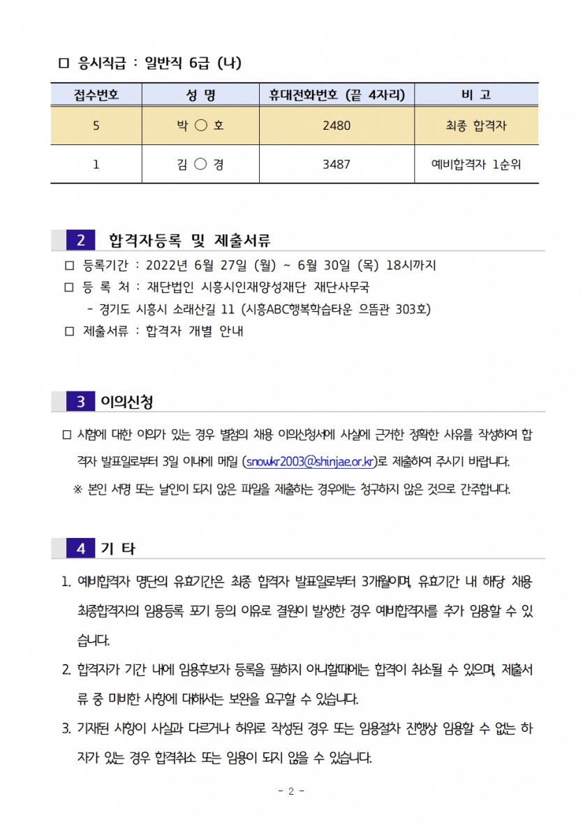 [채용] (재)시흥시인재양성재단 제3회 직원 공개채용 최종합격자 공고