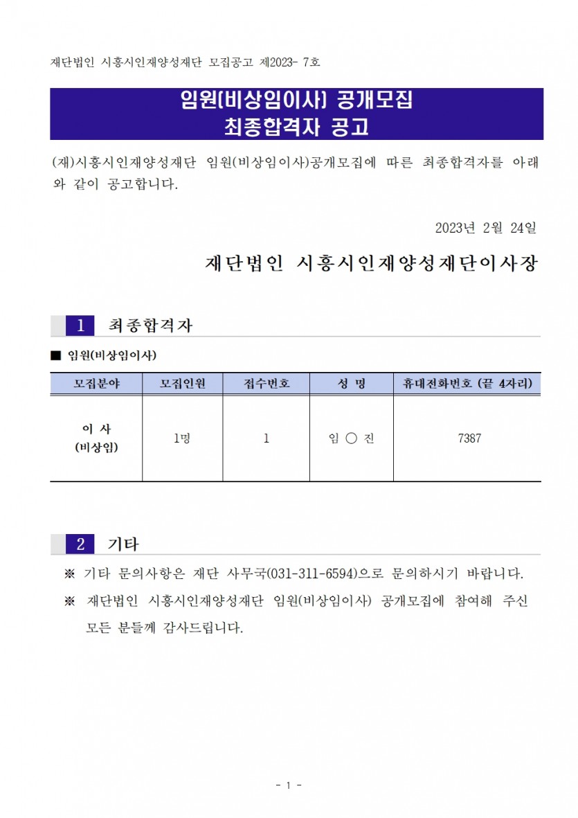 2023년 제1회 직원 공개채용 최종합격자 공고