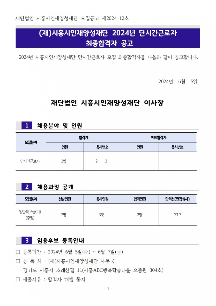 [채용] 2024년 단시간근로자 모집 최종합격자 공고