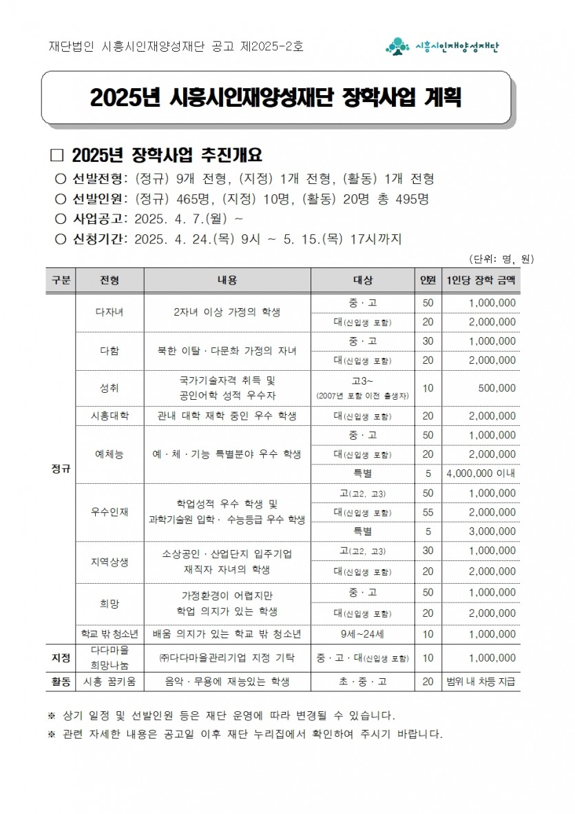 - 전년도(2024년)재단 장학금 수혜자 선발 제외(단, 예체능 전형 예외) - 관내 동일목적 장학금 수혜자 선발 제외(경기도 청소년 생활장학금)