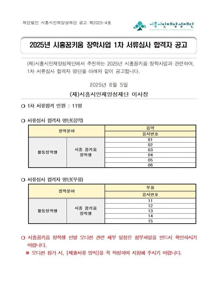 [공고] 2025년 시흥꿈키움 장학생 1차 서류심사 합격자 공고