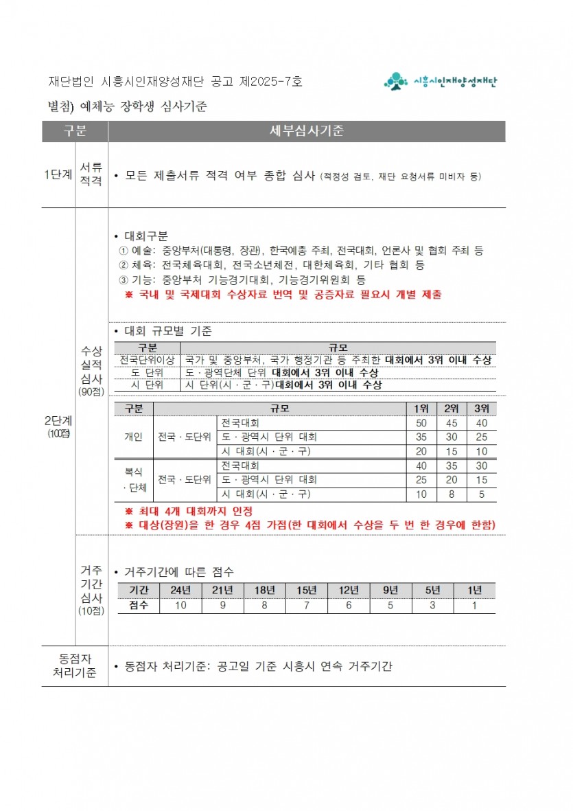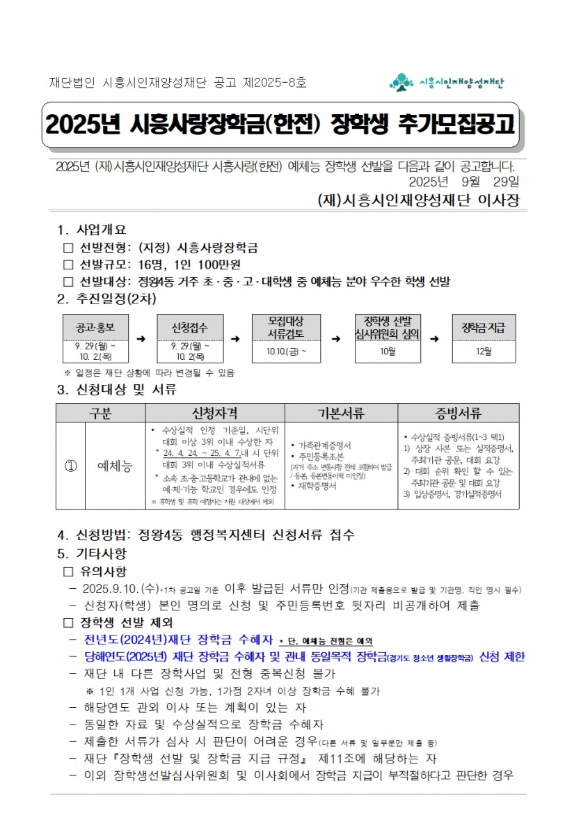 [공고] 2025 시흥시인재양성재단 시흥사랑장학금(한전-정왕4동) 예체능 장학생 추가모집 공고