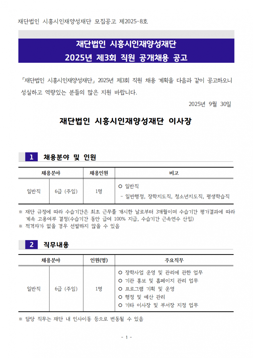 2025 시흥시인재양성재단 시흥사랑장학금(한전-정왕4동) 예체능 장학생 추가모집 공고