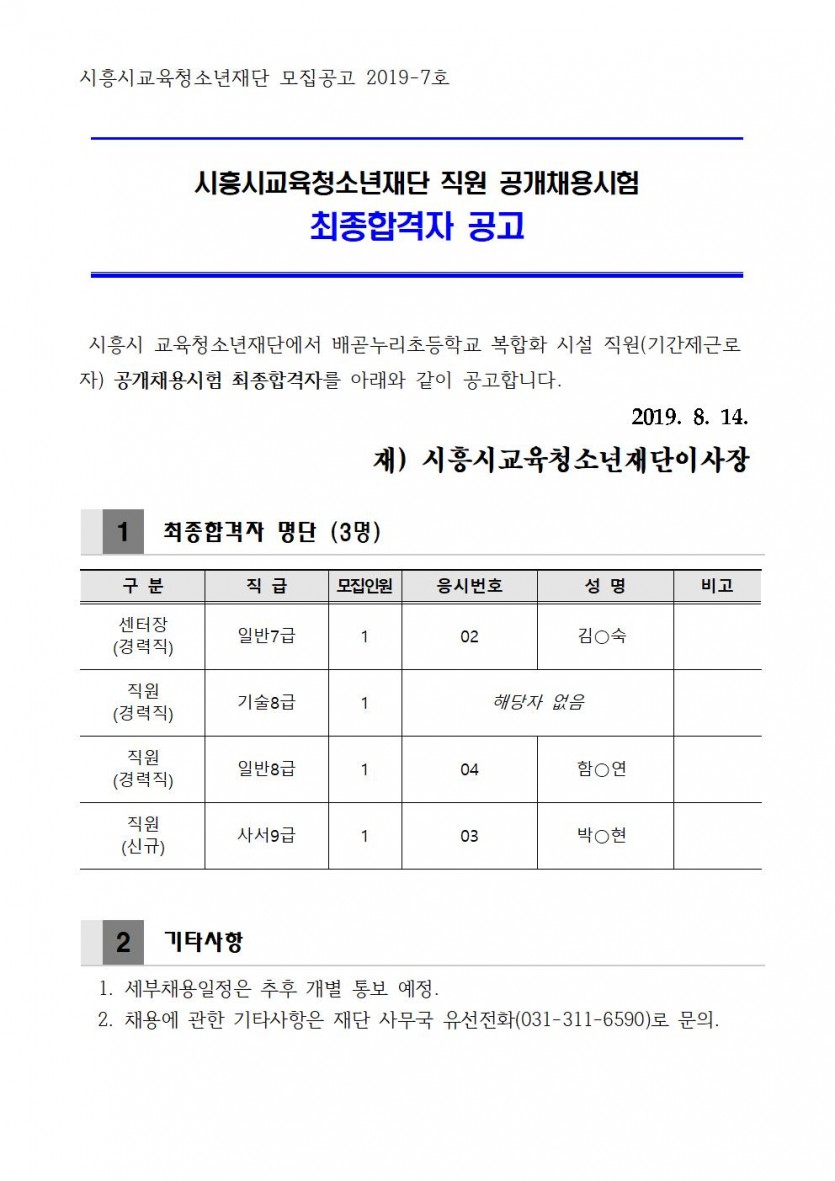 시흥시교육청소년재단 모집공고 제2019-7호. 직원(기간제) 공개채용시험 최종합격자 공고.hwp
