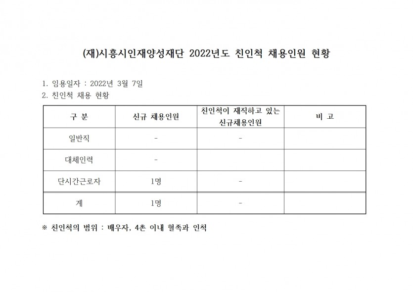 [친인척 채용인원 공개] 2022년도 신규채용 관련 임직원 친인척 현황 공시 (3월)