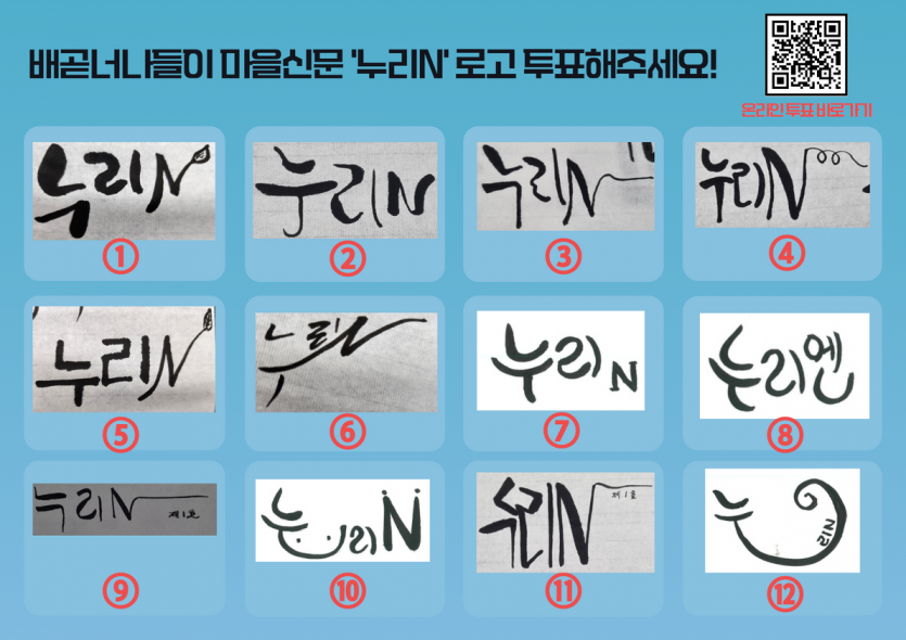 | 강좌명 | 배곧너나들이 마을신문 '누리N' 로고 투표 | 접수방법 | 온라인 / 오프라인 투표 |