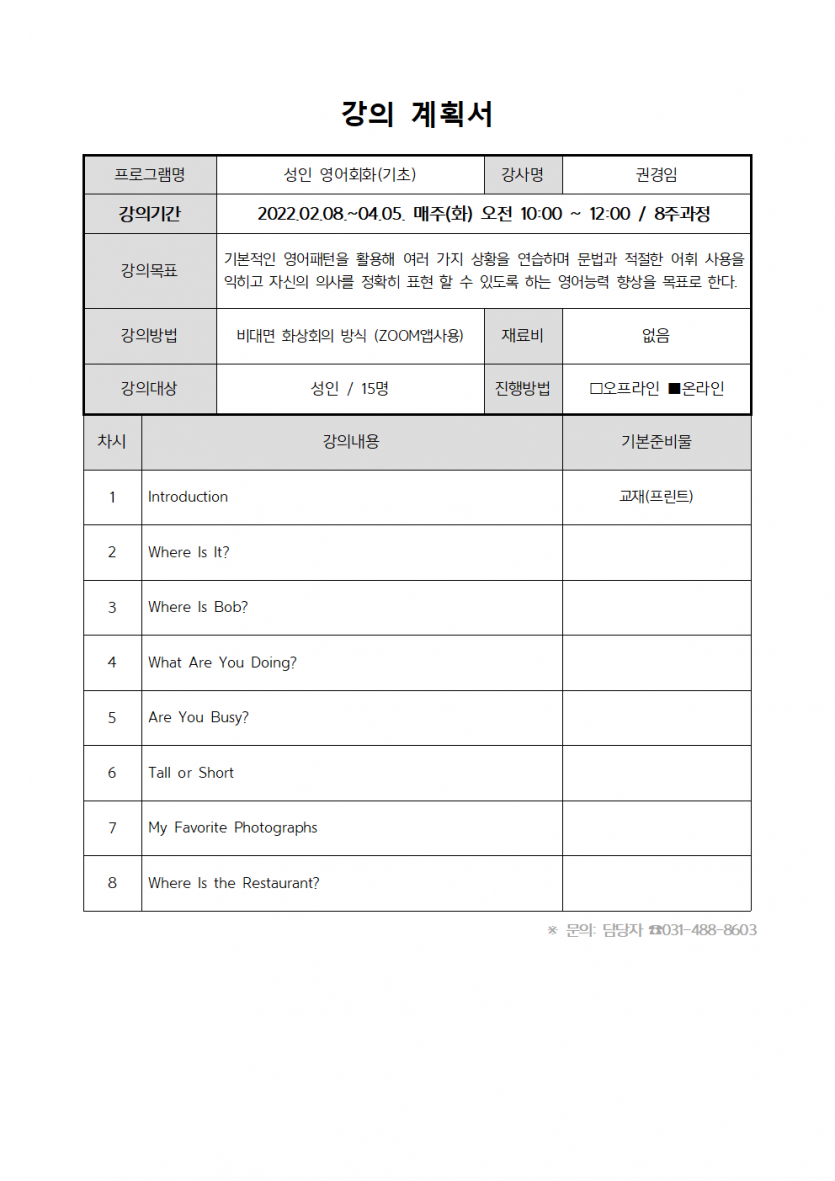| 강좌명 | 기초영어회화 | 접수방법 | 온라인 신청(선착순) |