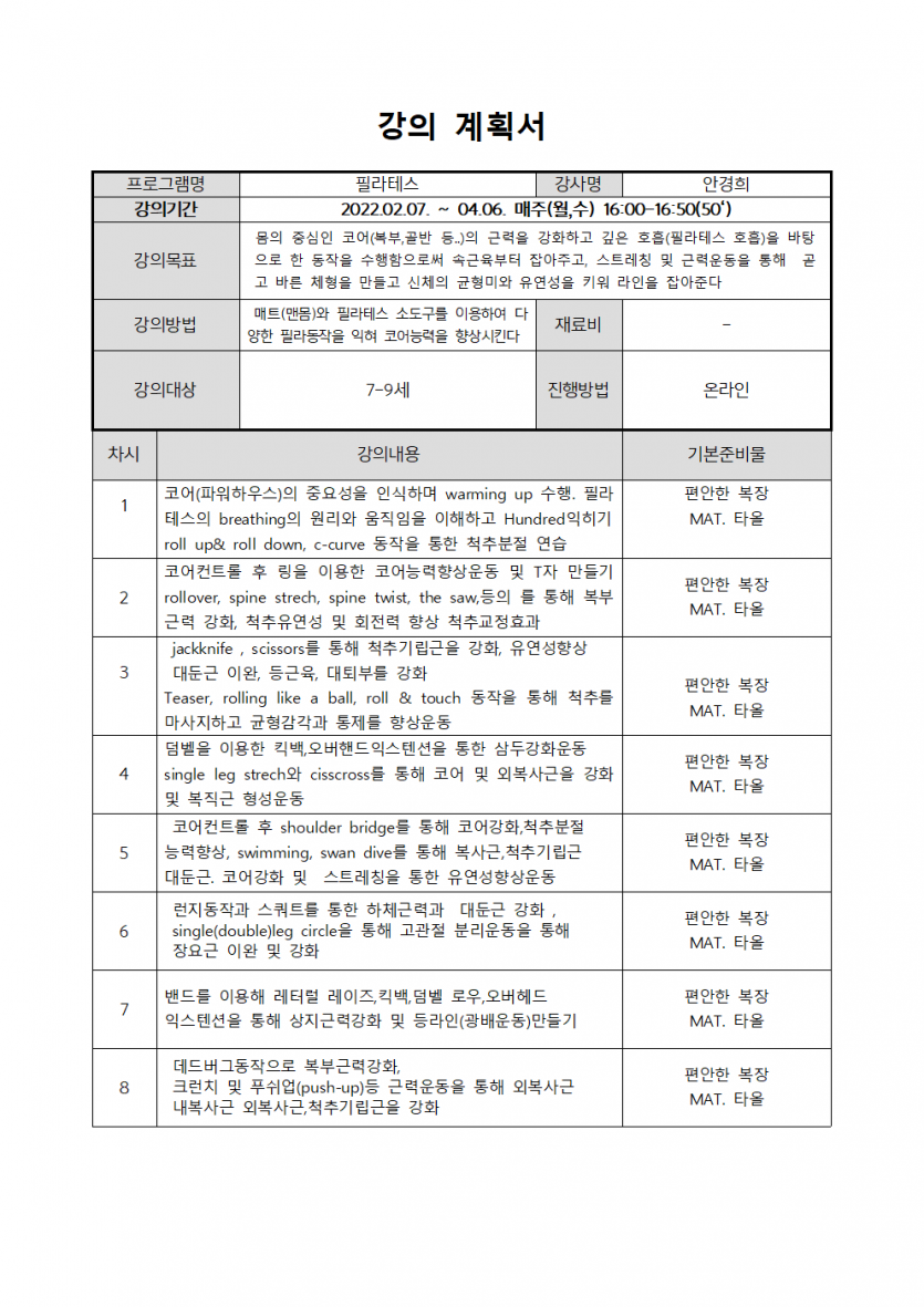| 강좌명 | 어린이 필라테스 | 접수방법 | 온라인 신청(선착순) |