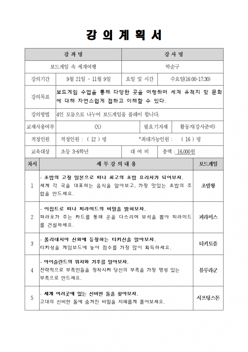 | 강좌명 | 4분기 교육프로그램 - 보드게임 속 세계여행 | 접수방법 | 온라인 신청(선착순 접수) |