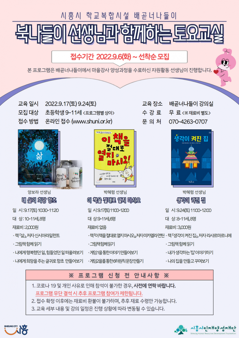 | 강좌명 | 9월 북나들이 선생님과 함께하는 토요교실 프로그램 안내 | 접수방법 | 온라인 신청(선착순) |