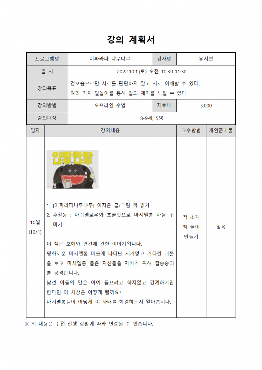 강좌명 10월 토요교실 프로그램 - 이파라파 냐무냐무(8-9세) 접수방법 온라인 신청(선착순)