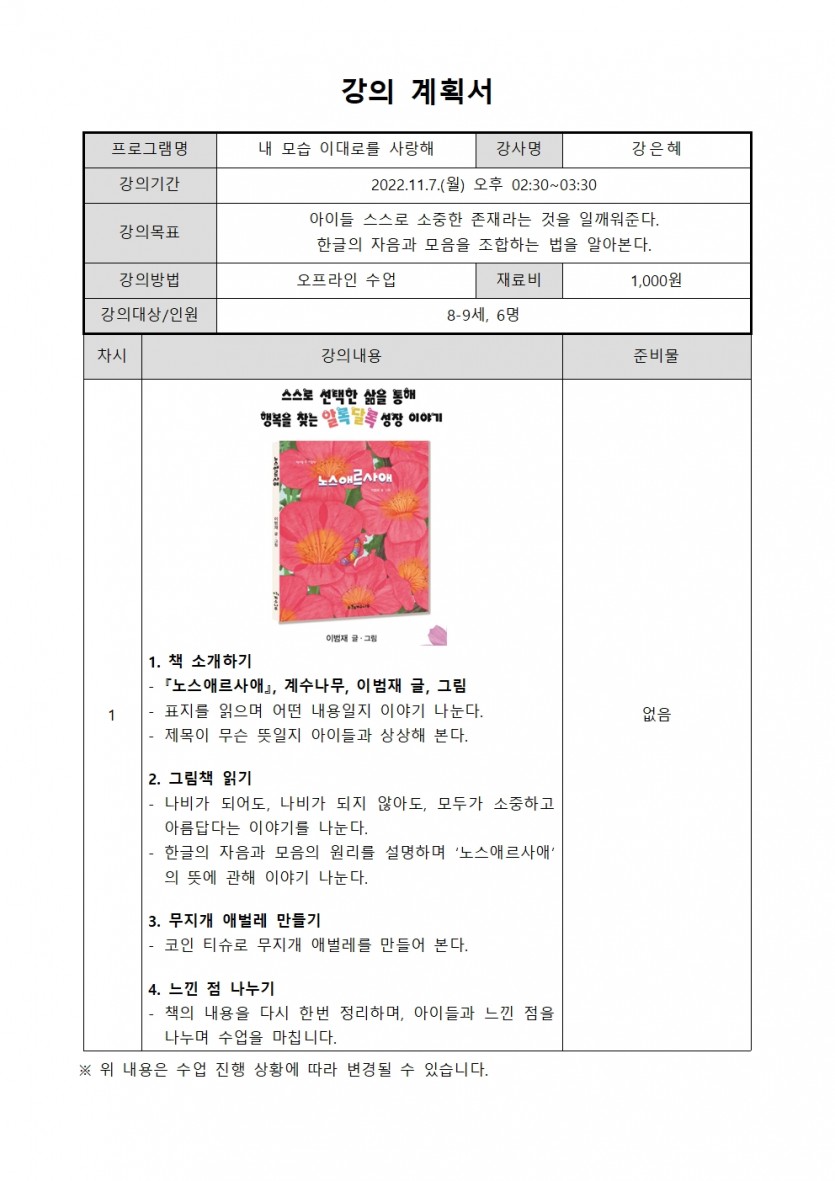 11월 북나들이 프로그램 - 내모습 이대로를 사랑해(8-9세)
