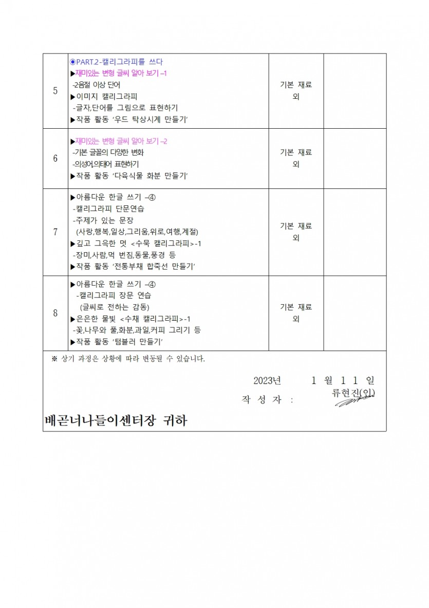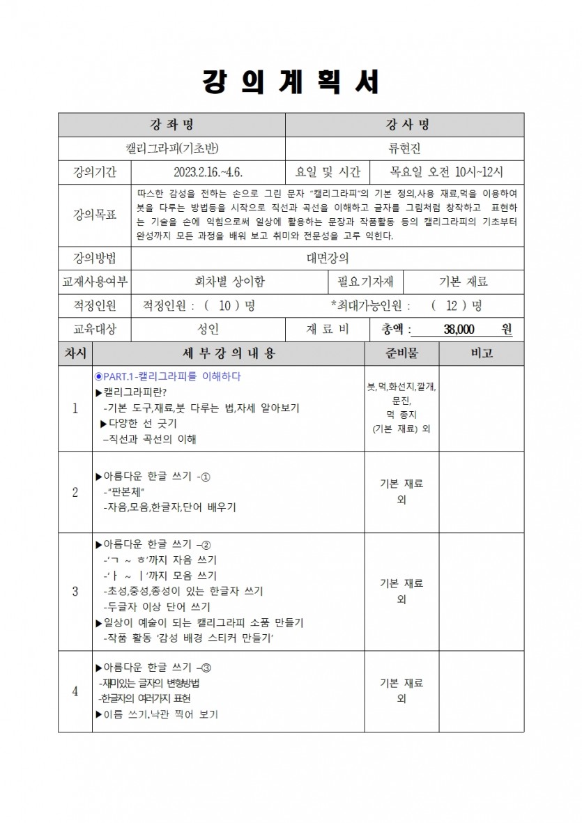 | 강좌명 | 2023년 1분기 평생교육프로그램 - 캘리그라피(기초반) | 접수방법 | 온라인 접수(선착순) |