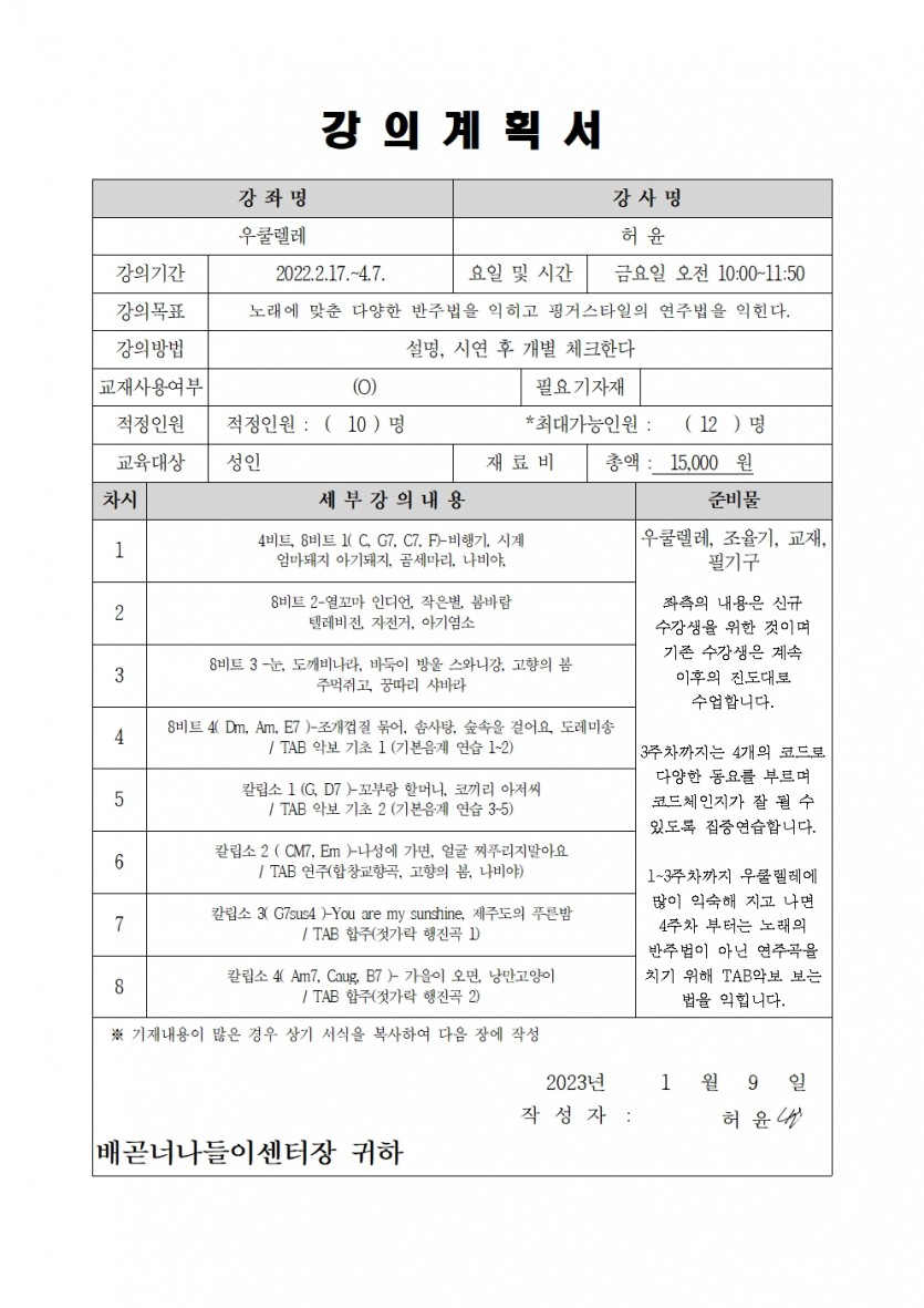 | 수강료 | 10000 | 재료비 | 15,000원 / 우쿨렐레 개별준비 |