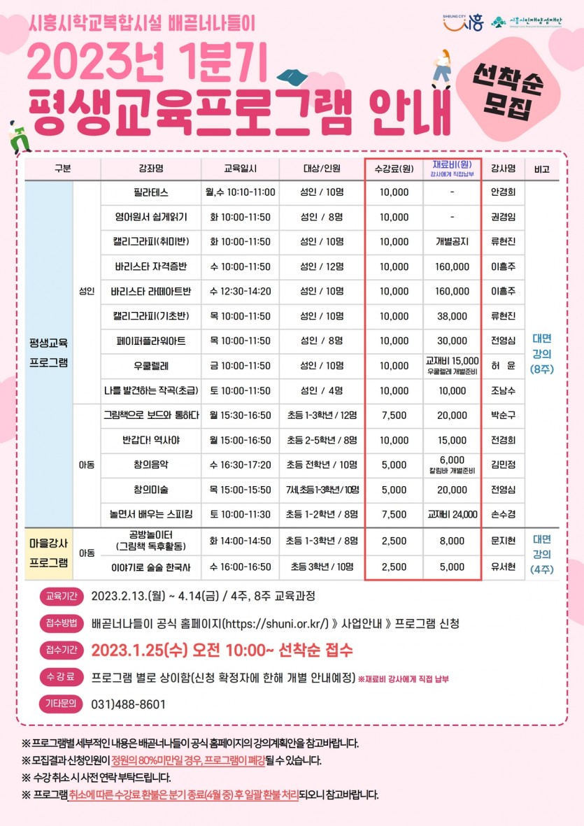 강좌명 2023년 1분기 평생교육프로그램 신청 안내 접수방법 온라인 접수(선착순)
