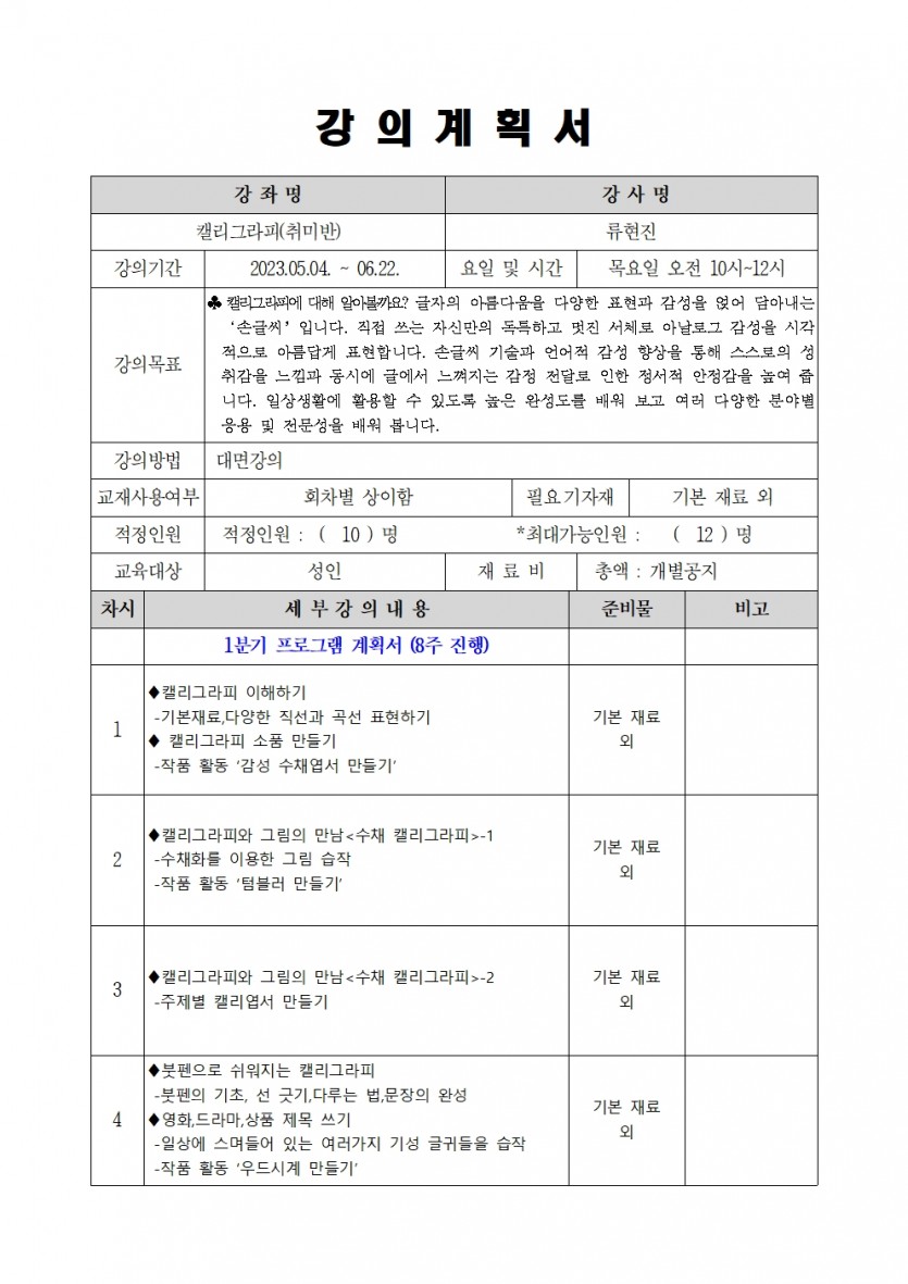 | 강좌명 | 2023년 2분기 평생교육프로그램 - 캘리그라피(취미반) | 접수방법 | 온라인 접수(선착순) |
