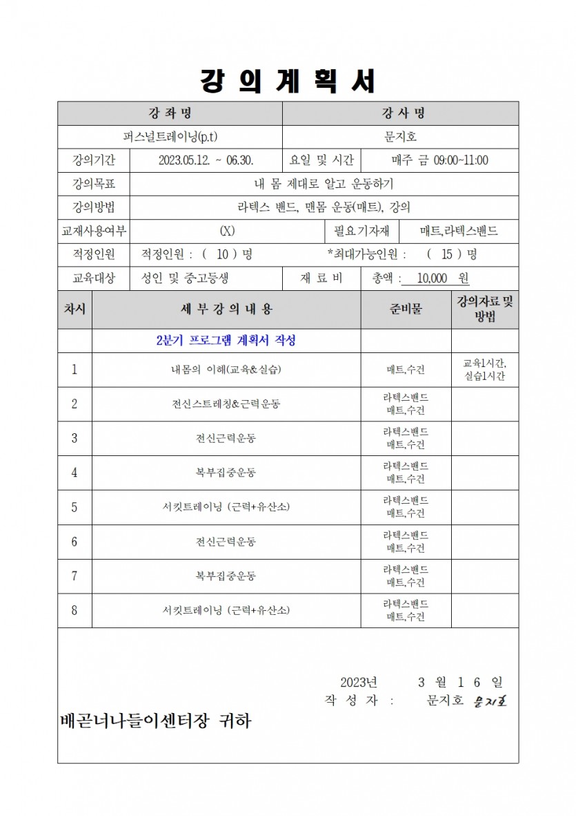| 강좌명 | 2023년 2분기 평생교육프로그램 - 퍼스널 트레이닝 | 접수방법 | 온라인 접수(선착순) |