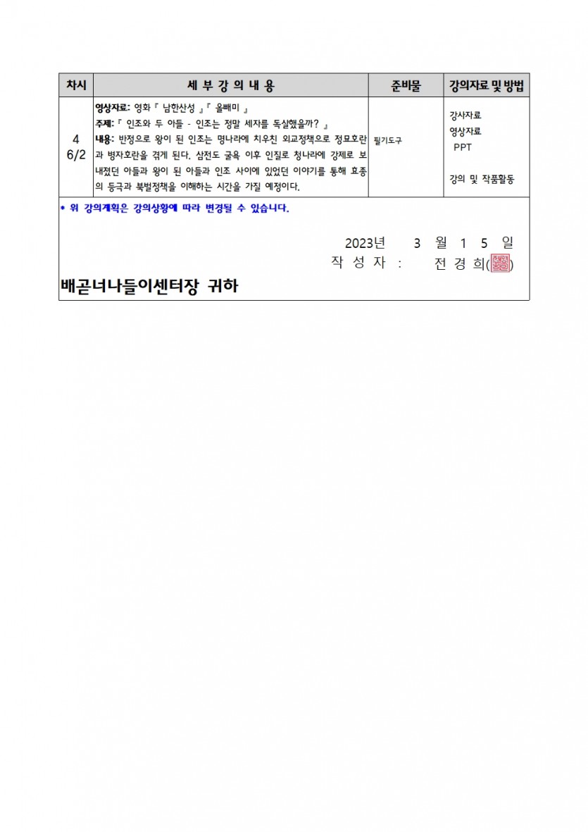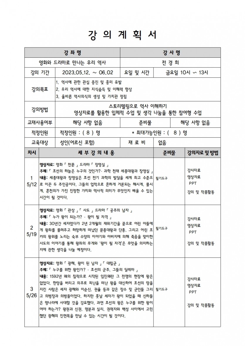 | 강좌명 | 2023년 2분기 평생교육프로그램 - 영화와 드라마로 만나는 우리 역사 | 접수방법 | 온라인 접수(선착순) |