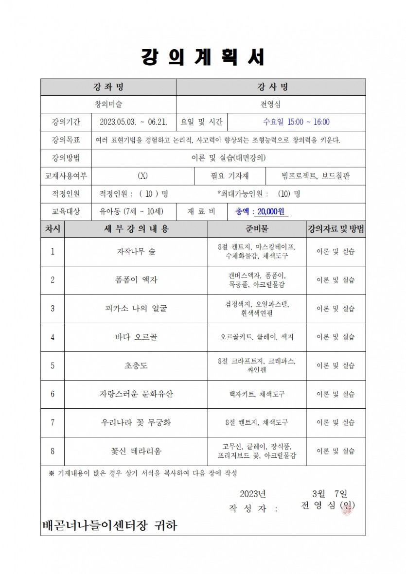 | 강좌명 | 2023년 2분기 평생교육프로그램 - 창의미술 | 접수방법 | 온라인 접수(선착순) |