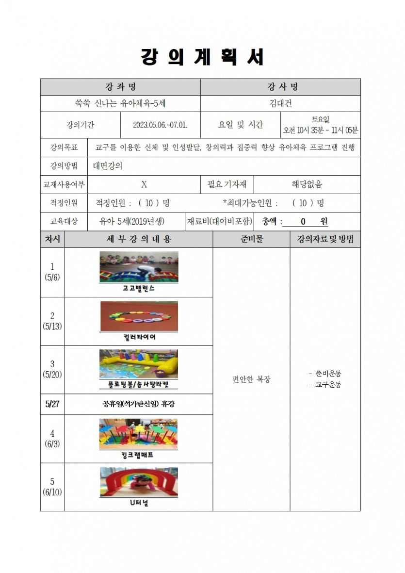 강좌명 2023년 2분기 평생교육프로그램 - 쑥쑥! 신나는 유아체육(5세) 접수방법 온라인 접수(선착순)