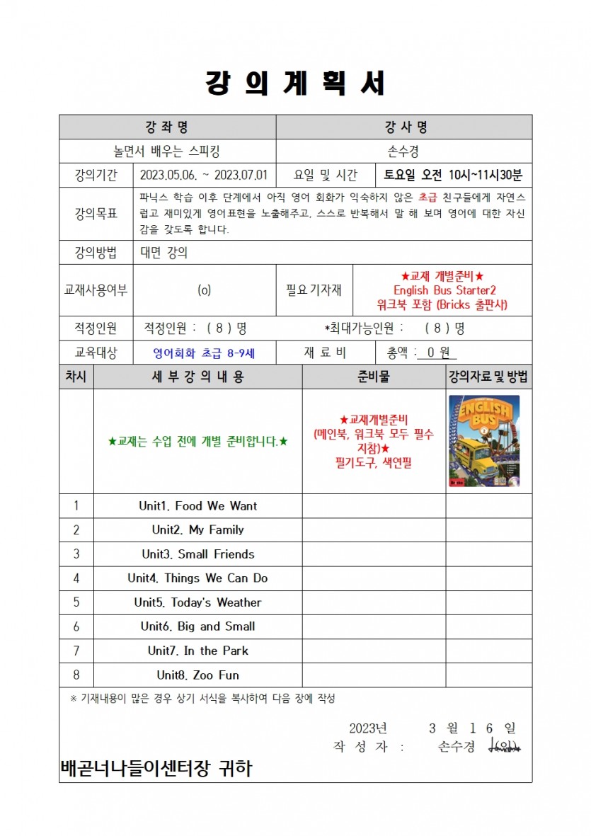 | 수강료 | 7500 | 재료비 | 교재 개별준비 |