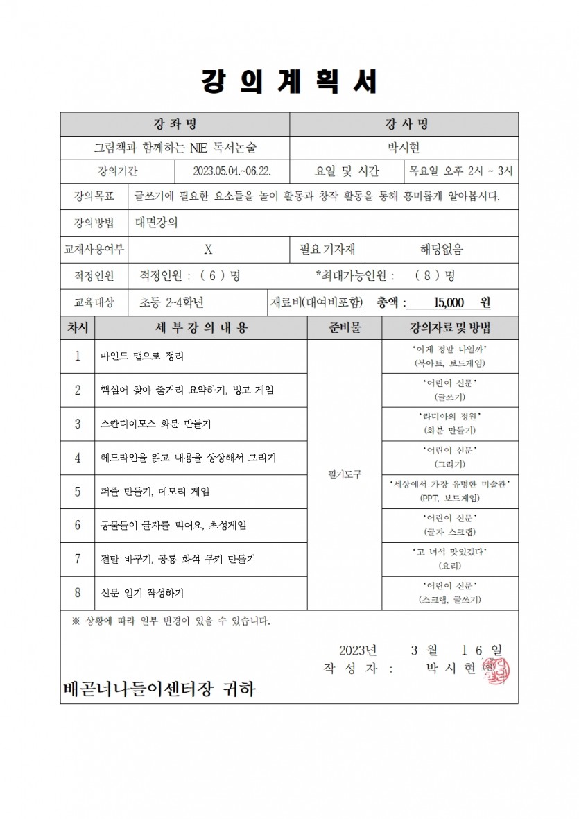 | 수강료 | 5000 | 재료비 | 15,000원 |