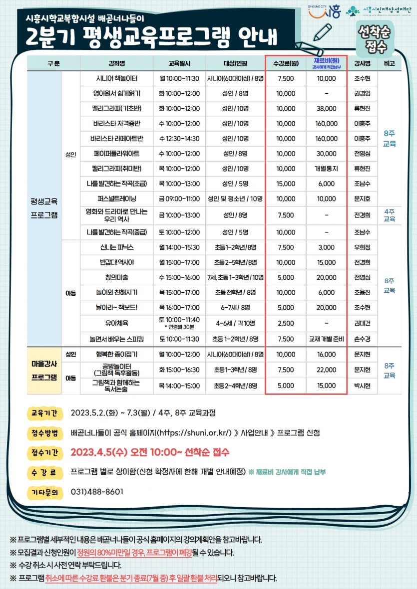 | 강좌명 | 2023년 2분기 평생교육프로그램 신청 안내 | 접수방법 | 온라인 접수(선착순) |