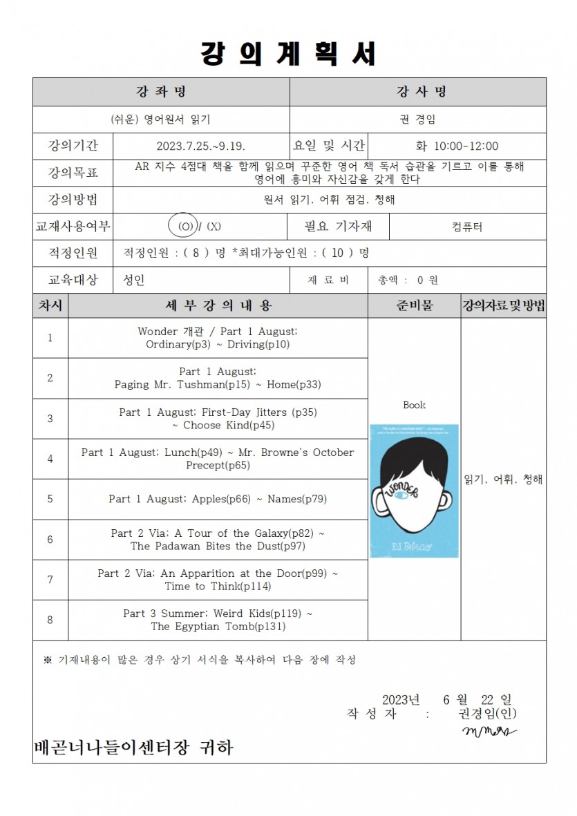 | 강좌명 | 2023년 3분기 평생교육프로그램 - (쉬운) 영어원서 읽기 | 접수방법 | 온라인 접수(선착순) |