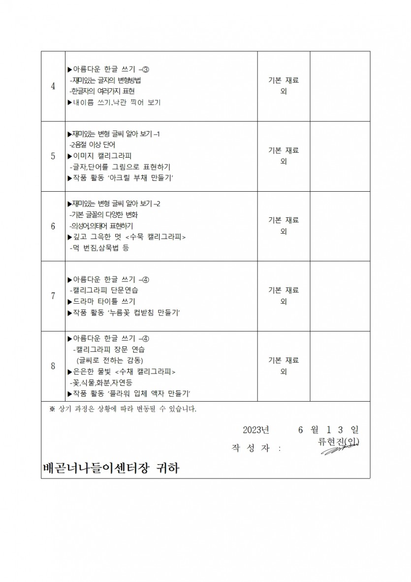 강좌명 2023년 3분기 평생교육프로그램 - 캘리그라피(기초반) 접수방법 온라인 접수(선착순)