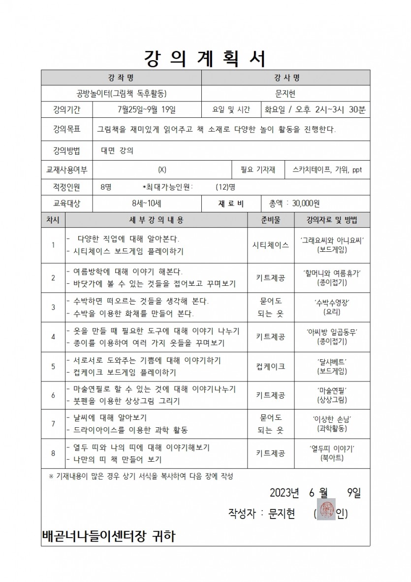 | 강좌명 | 2023년 3분기 평생교육프로그램 - 공방놀이터(그림책 독후활동) | 접수방법 | 온라인 접수(선착순) |