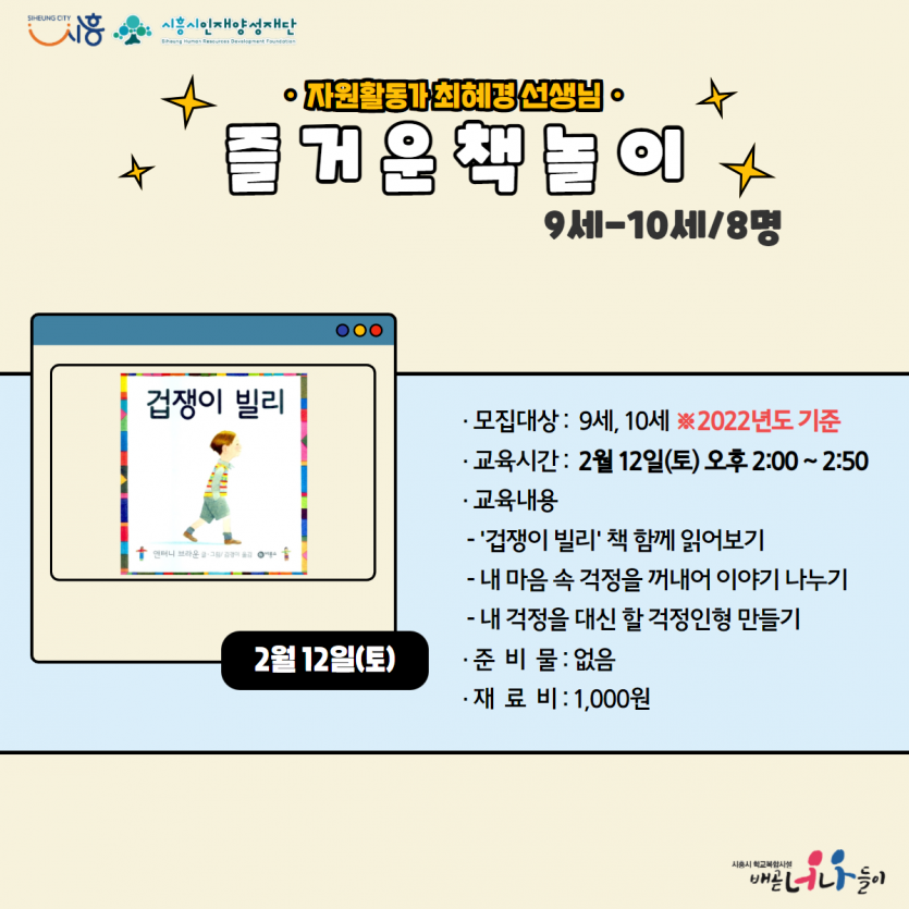 | 강좌명 | 작은도서관 토요교실 - 즐거운 책놀이 | 접수방법 | 온라인 신청(선착순) |