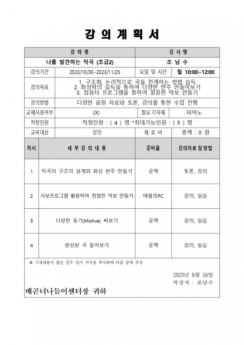 | 강좌명 | 2023년 4분기 평생교육프로그램 - 나를 발견하는 작곡(초급) | 접수방법 | 온라인접수(선착순) |