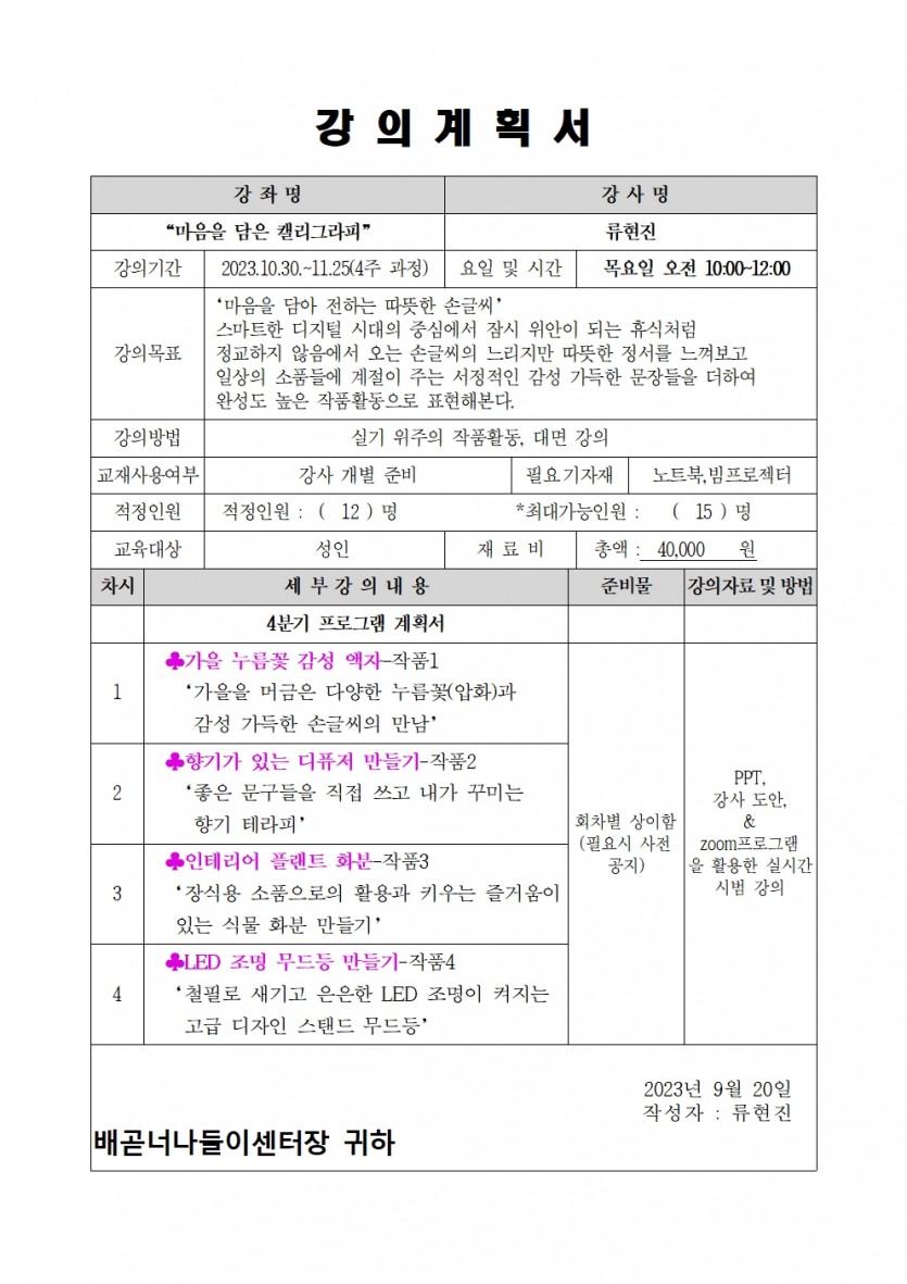 | 강좌명 | 2023년 4분기 평생교육프로그램 - 마음을 담은 캘리그라피 | 접수방법 | 온라인접수(선착순) |