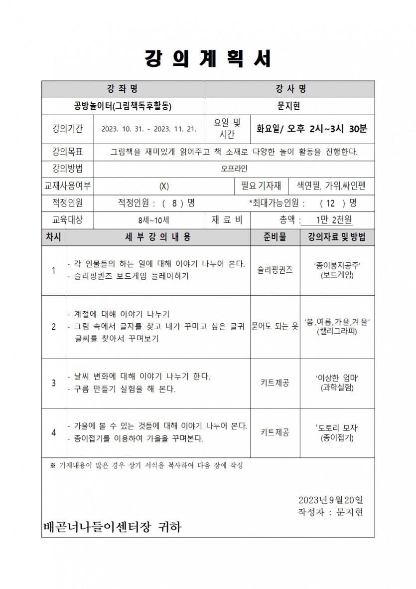 | 강좌명 | 2023년 4분기 평생교육프로그램 - 공방놀이터(그림책 독후활동) | 접수방법 | 온라인접수(선착순) |