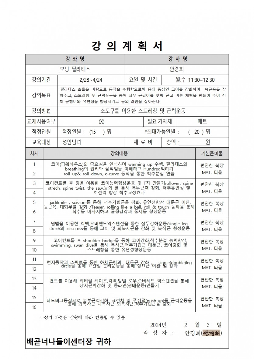 | 강좌명 | 2024년 상반기(1차) 평생교육프로그램 - 모닝 필라테스 | 접수방법 | 온라인접수(선착순) |