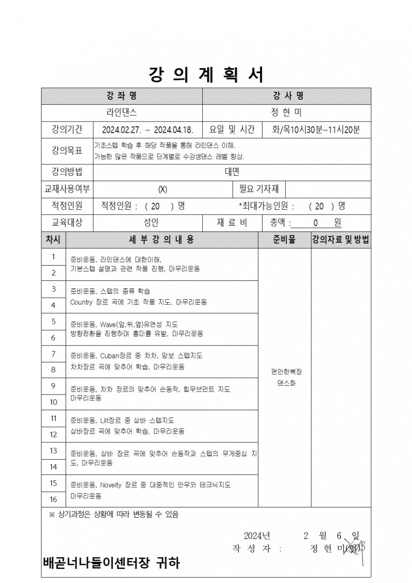 | 강좌명 | 2024년 상반기(1차) 평생교육프로그램 - 라인업! 라인댄스 | 접수방법 | 온라인접수(선착순) |