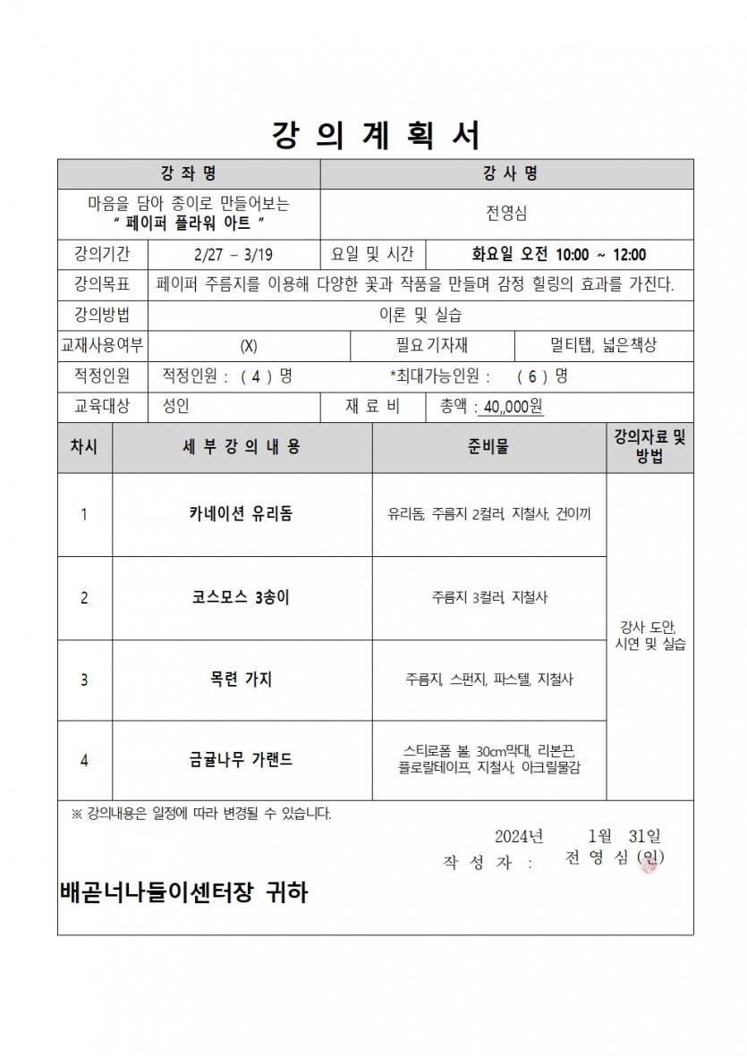 | 강좌명 | 2024년 상반기(1차) 평생교육프로그램 - 페이퍼 플라워 아트 | 접수방법 | 온라인접수(선착순) |