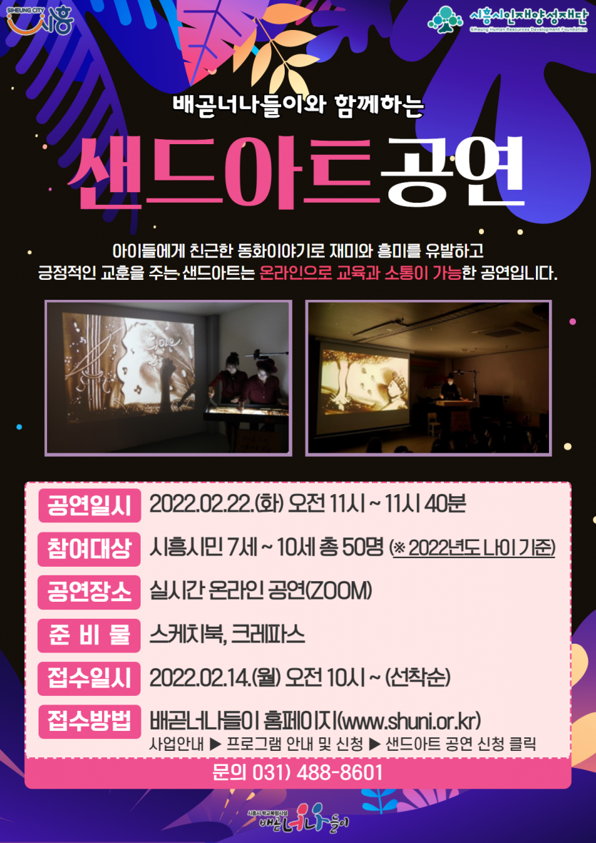 강좌명 배곧너나들이 샌드아트 공연 신청 접수방법 온라인 신청(선착순)