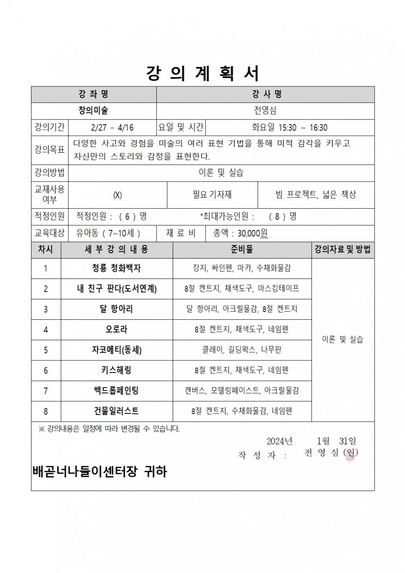 | 강좌명 | 2024년 상반기(1차) 평생교육프로그램 - 창의미술 | 접수방법 | 온라인접수(선착순) |