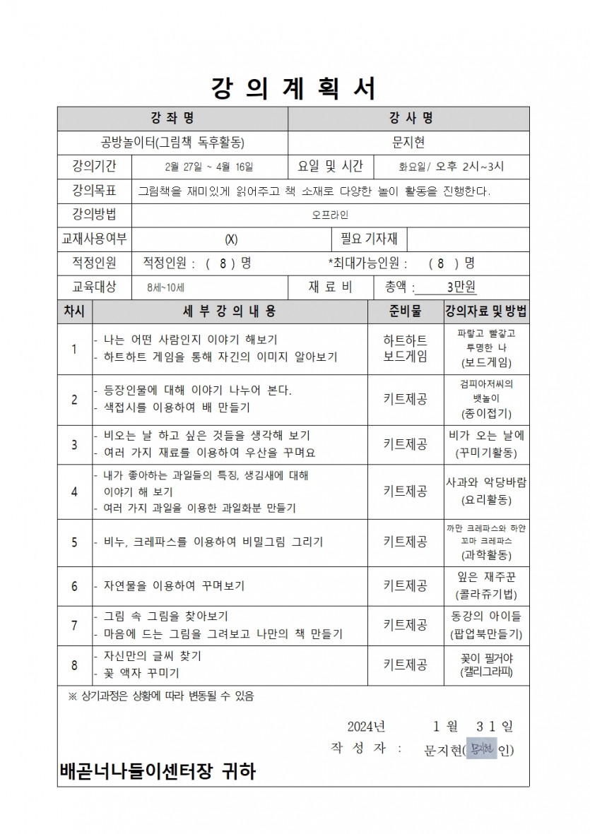 | 강좌명 | 2024년 상반기(1차) 평생교육프로그램 - 공방놀이터(그림책독후활동) | 접수방법 | 온라인접수(선착순) |