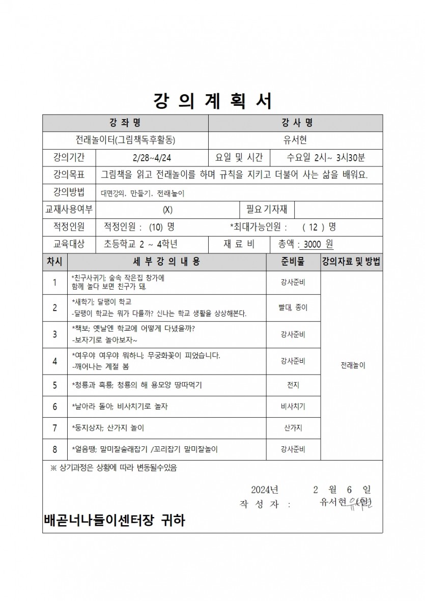 | 강좌명 | 2024년 상반기(1차) 평생교육프로그램 - 전래놀이터(그림책독후활동) | 접수방법 | 온라인접수(선착순) |
