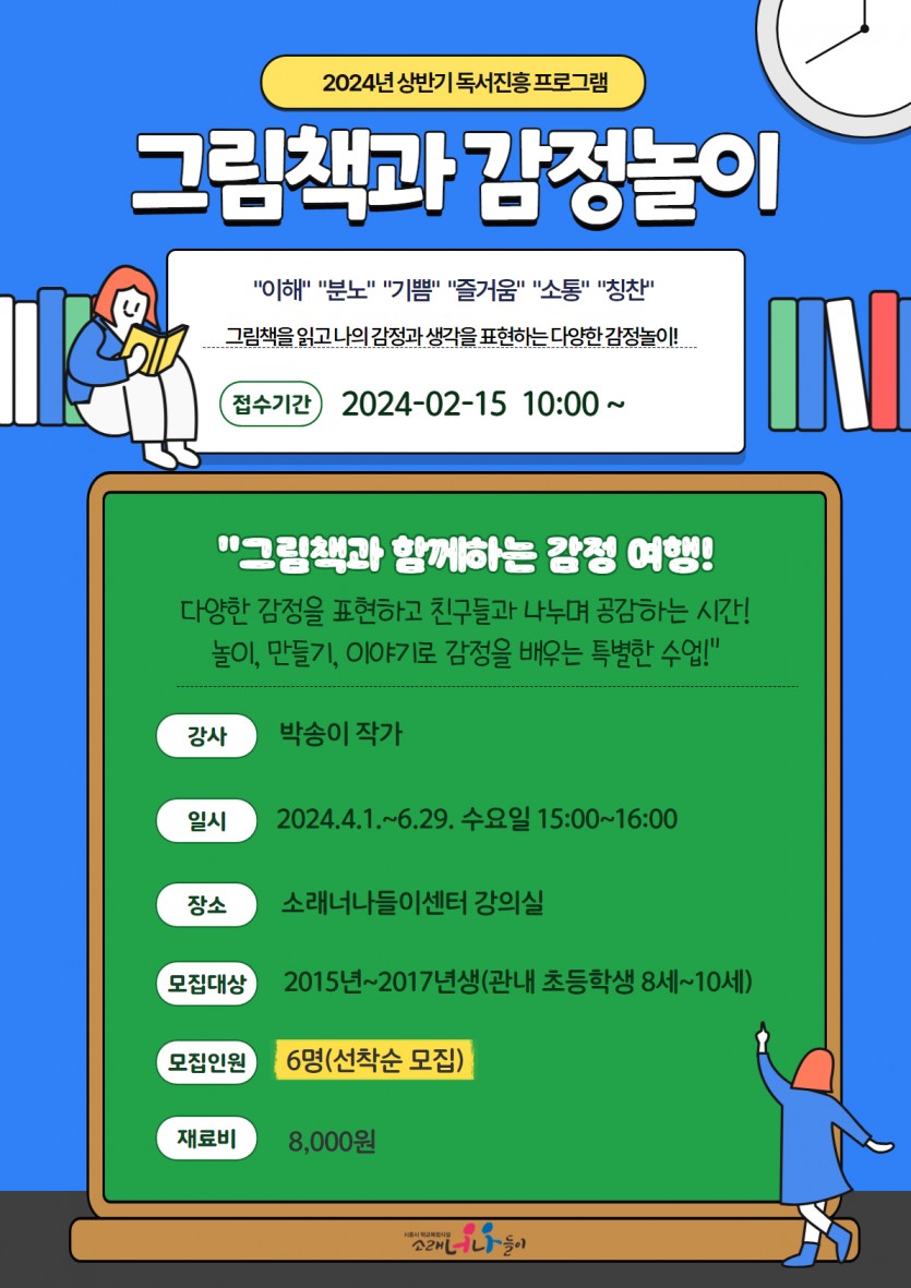 | 강좌명 | 2024년 상반기 독서진흥프로그램 - 그림책을 통한 다양한 감정놀이 | 접수방법 | 온라인접수(선착순) |