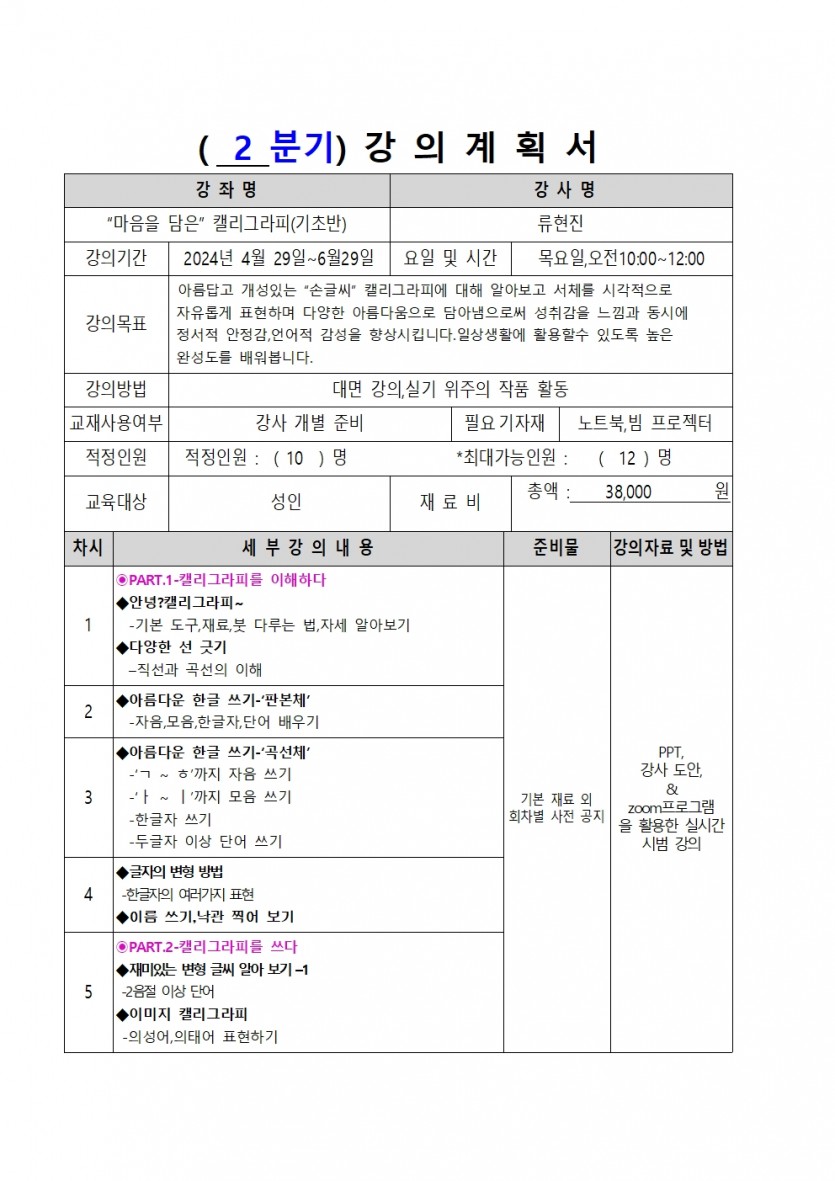 | 강좌명 | 2024년 상반기(2차) 평생교육프로그램 - 마음을 담은 캘리그라피 | 접수방법 | 온라인접수(선착순) |