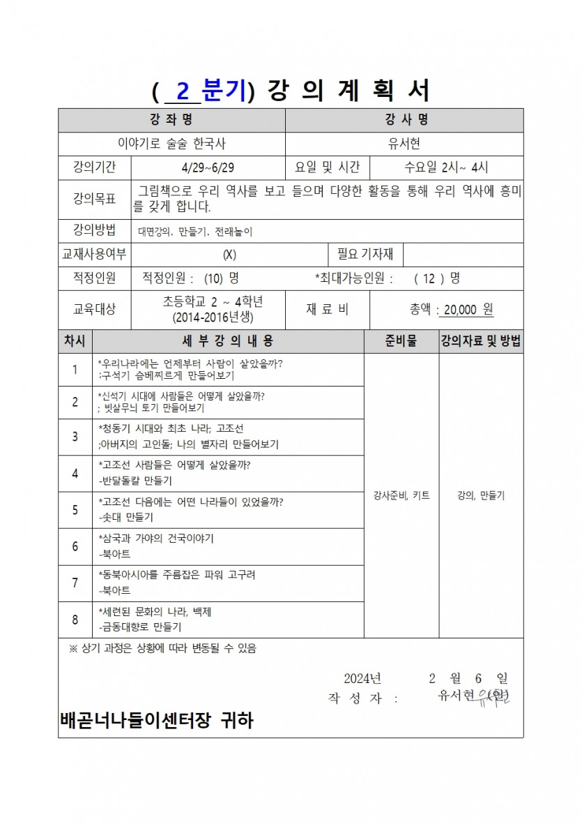 | 강좌명 | 2024년 상반기(2차) 평생교육프로그램 - 이야기로 술술 한국사 | 접수방법 | 온라인접수(선착순) |